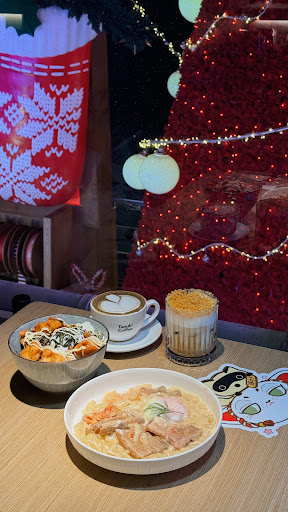 Cozy restaurant facing the Hong Kong harbour and now that itโs Christmas season, there are beautiful christmas decos ๐outside too! They have a variety of options on their menu, including pasta and rice ๐, you could enjoy some of their specialty coffee along with their good food! Here are what I tried on their menu: