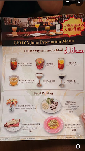 位於銅鑼灣的「The CHOYA Ginza BAR ( @CHOYA_HK )」是日本梅酒品牌The CHOYA的常設雞尾酒吧,風格繼承位於東京銀座的旗艦店,並提供超過50多款精釀雞尾梅酒及日本梅入饌之美食,望能以傳統與創新的獨特融合的形式,將梅酒的魅力推廣至國際舞台。