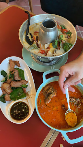 We ordered the prawn red curry, the pad Thai, Tom yum soup, crispy pork neck. The currys flavor is perfect! It’s rich and flavorful; they’ve cooked the prawn heads in with the curry so it’s rich, we practically wanted to drink it! The crispy pork neck was perfectly done; usually when they say crispy it’s overdone and a bit tough, but not here, it’s tender inside and has a slight crunch on the outside, it’s a great texture. The pad Thai and soup was loaded with prawn and veggies inside. Spice level was nicely balanced; even the red curry which felt a bit spicy at first seemed to mellow out by the end of the meal.