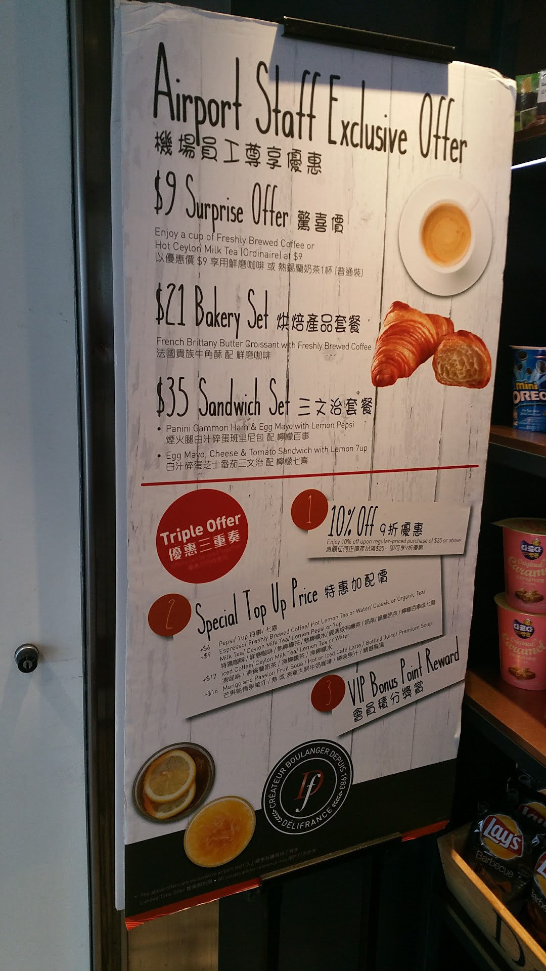 Read moreI only ordered an almond pastry and cold milk tea here. The pastry was filled with almond paste. It was really yummy. The cold milk tea was very tasty as well. This place has almost everything minus the kitchen sink. U can buy sandwiches, pastries, cookies, teas, chips, pizzas, yogurt, burritos, candy and drinks. If u r planning to catch a flight to the US, u will drink your drink quickly since u will need to pass a second security in which beverages are not allowed. I wish I had known this b4 I had made...