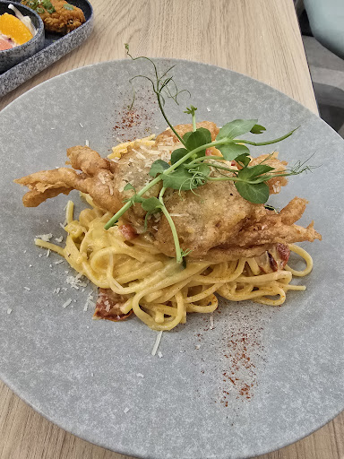 Items Ordered: 🥚 Salted Egg Yolk Pasta with Fried Soft Shell Crab We were most excited about this one, it looked so yummy in the picture. The fried soft shell crab was crispy and well done, but the salted egg yolk sauce was unfortunately a bit too rich and heavy for us. The flavor was intense and kinda overwhelmed the whole dish.