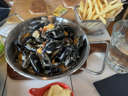 Of course, I ordered the crepe, which was a traditional French ham and cheese with a sunny-side-up egg. The restaurant is called "Completed," and it was quite goodāthe ingredients were perfectly balanced, not too greasy, and very tasty. I was tempted to order a sweet crepe as well, but I knew I couldn't eat another one, so I ordered a plate of mussels for my friend instead. They were small blue mussels, cooked perfectly and very fresh, and the portion was generous. One crepe, a plate of mussels with fries, and a cider made for a delicious meal!