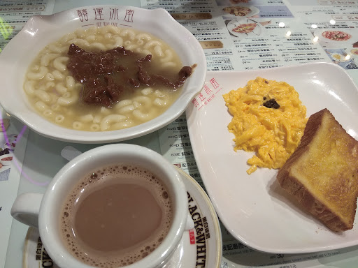 I ordered a set meal ā satay beef macaroni soup, scrambled eggs with black truffles, a slice of Denmark toast and a cup of hot Ovaltine.