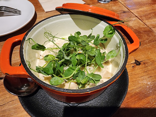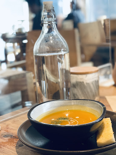 Stylish restaurant plating French meals in an informal environment with an art theme.