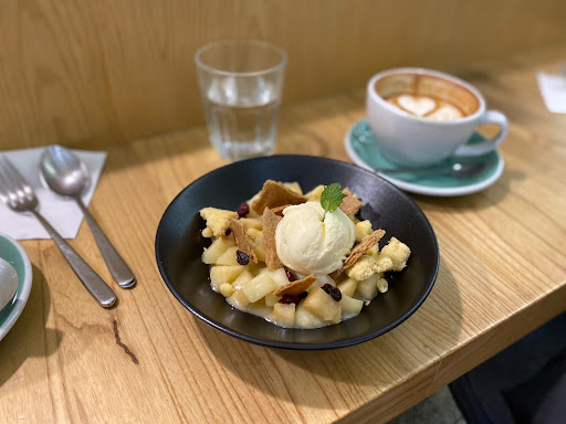 Read moreCozy place to spend some time just relaxing. Came here on a Saturday afternoon after lunch nearby, waited around 5 mins for the table. Ordered one flat white, one hojicha latte and an apple crumble.