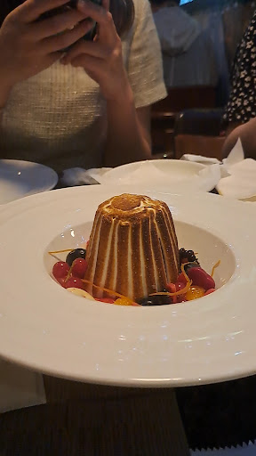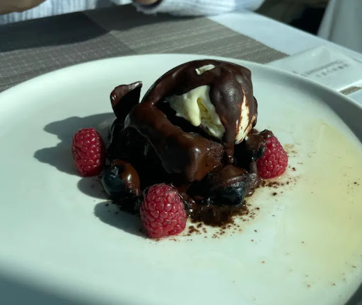 Flaming Chocolate Sphere - $88 A truly Instagram-worthy dessert! Rum is poured over the chocolate sphere and set aflame, making for a visually stunning presentation (especially at night). The dessert features layers of dark chocolate—from the shell to the sauce and brownie—giving it a rich and indulgent flavor without being overly heavy. Paired with tangy blueberries and raspberries, the fruit’s acidity balances the richness and adds a refreshing depth...