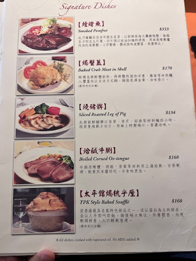 I really enjoy going to this restaurant. This is the second time I have visited this restaurant with my family the last time was over 10 years ago. I wasn't sure whether its still around after hearing a lot of the old favorites in the city have closed so happy to be able to try it again. The food quality and taste are very much as my first visit back then which is excellent. The signature dish of chicken wing in Swiss Sauce, Portuguese Style Chicken rice and Ox tongue are must for me. Souffle is also a must too even tho we haven't got room for it this time but have try it during my first visit. Atmosphere wise its more of the mid 20th century vibe, kind of take you back in time to its heydays in Hong Kong. The waiters are very much dress to that era and seems to me they have been with the restaurant a long time too. Very professional in their service. Prices are on the higher end but the quality is there and the uniqueness is worth it. If you want to try something that showcase the taste of old Hong Kong with fusion of east and west cooking I would highly recommend this place while its...