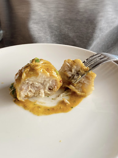 Stewed dumplings involve pouring curry sauce into the dumplings, similar to soup dumplings. Each serving contains 8 dumplings, and each dumpling is quite large. It's impossible to eat it in one bite; you have to cut it open first.