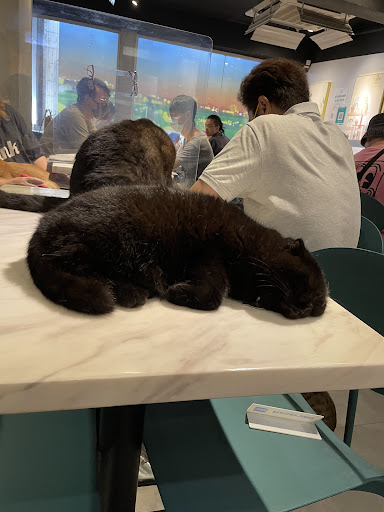 Read moreFood is fine for a cat cafe. But as a cat lovers, i am more concerned of the cats' welfare. The cafe is way too small for so many cats and customers. There are no cat furnitures at all in the visible area. Yes it is cute that they sleep on your laps or bags yet its not like they have other options. There is definitely not enough space for the cats to have alone time n hide from the customers. For that many cats i can only see one water fountain. Customers forced n tried to hold the cats and no staffs cared to stop them. The tables were not cleaned up immediately so there were plenty of chances for the cats to consume the leftovers. Cats seems healthy except minor eye infections. Though i doubt how clean is the litter box area, since most of the cats have yellow stain on their white feet. Lastly most of the cats seems pure breed, n many of them are Scottish fold. I hope they treat them well n provide proper medical treatments when the cats are old n gonna be sick. Overall I won't recommend people who really care about cats to go. It just makes me uncomfortable and think about how poorly they r...