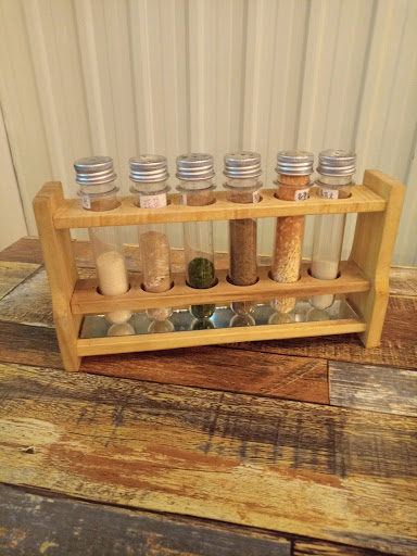 I was attracted by the retro windows by the kitchen and the racks of test tube condiments on the table.