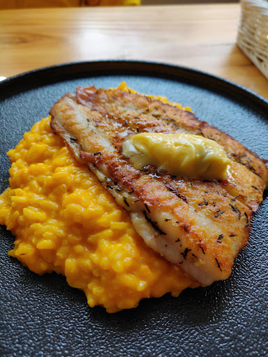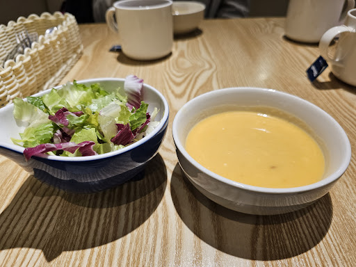 Panseared sole in pumpkin risotto. Good value for the main dish but poor choice of combination when there are two starters you can choose from, and one of them is just a slice of baguette with garlic butter. Guys... That's not a starter; that's a side to complement soup or a salad. Get it right. To be fair, the other starter you could choose was a crispy salad with yuzi dressing. (This is where you can serve your toast; don't separate the two and make as if there are two starters to select.) I ended enjoying that too as we had another person joining me who also ordered a lunch set. Fresh greens and nice combination. Can't say the service is good. With the exception of one girl with short dyed hair, who was very welcoming at the entrance and went out of her way to rearrange seating so we did not have to wait too long in queue, I can't feel like the staff is happy to...
