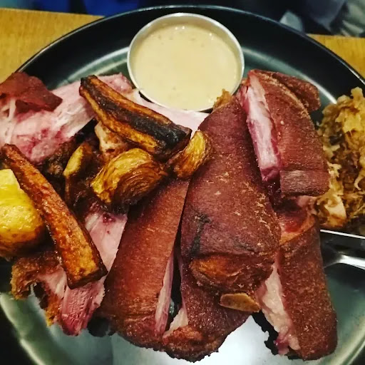 The dish goes with sauerkraut and roasted rooted vegetables. The portion is really big โ recommend it to be shared among 3-4 person.