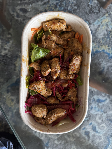 This is a simple and straight-forward place, only a few informal tables for seating on the pavement in front of the shop. A crew behind the counter working hard preparing wraps, salad and rice base dishes with your choice of meat, falafel or halloumi. They offer a handful of other mainly Turkish and Greek orders as well.