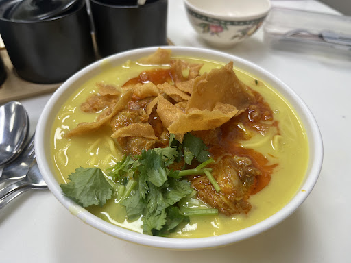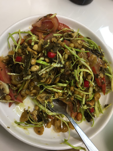 堪稱緬甸經典國民美食嘅鹹茶葉撈. 用已經葉制咗嘅茶葉,再加一啲口感鬆脆嘅材料. 如花生, 已經過油炸脆卜卜嘅蠶豆同鹹豆, 炸蒜,香蔥等等. 好味到講起都流口水. 唔係時時有得食㗎,要睇季節㖭. 午餐,三餸一湯再加大碟白飯. 重點係好味同價錢相宜. 可另加是日例湯. 傳統魚湯粉有料湯底濃度適宜. 仲有好多脆脆炸豆 放喺面. 有次早到左11am前,午餐仲未出得街. 一時肚餓,試試椰汁雞麵先,又真係得喎. 再加咖喱撈麵,配緬甸奶茶, 得咗. 店舖老細很多時午後在舖頭,徤談友善.