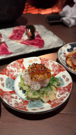 We opted for a selection of small plates to maximize our tasting experience. The sashimi, a modern interpretation of the classic dish, was a delightful departure. The scallop with sea urchin caviar on top a crisp, tempura-fried shiso leaf was delicate and refreshing, though the uni's flavor was somewhat understated. Next, the otoro tuna with scallop and truffle on a crispy base was a masterpiece; the richness of the tuna played beautifully against the delicate scallop, the earthy truffle providing a sophisticated counterpoint. The textural interplay was superb—luxurious, smooth, and yielding. The Wagyu beef with foie gras was similarly well-balanced, the richness of the meat perfectly complementing the sweetness and fattiness of the foie gras.
