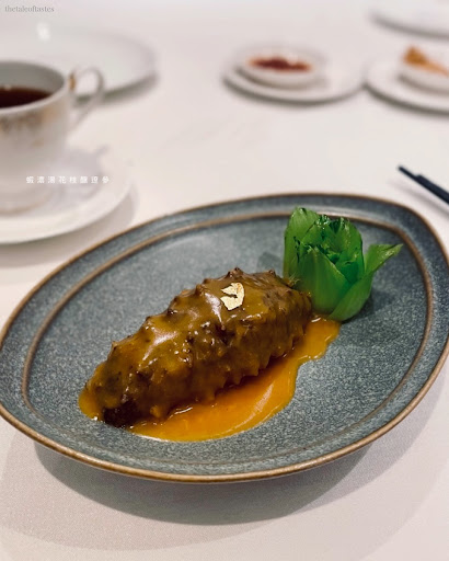 ➤ 蝦濃湯花枝釀遼參, $288/pc (8/10) 𝙎𝙩𝙪𝙛𝙛𝙚𝙙 𝙨𝙚𝙖 𝙘𝙪𝙘𝙪𝙢𝙗𝙚𝙧 𝙬/ 𝙘𝙪𝙩𝙩𝙡𝙚𝙛𝙞𝙨𝙝 𝙢𝙤𝙪𝙨𝙨𝙚 𝙞𝙣 𝙥𝙧𝙖𝙬𝙣 𝙟𝙪𝙨 The stuffed sea cucumber, generously sized, reveals a tender interior containing cuttlefish mousse of delicate meatiness. Encased in prawn jus that achieved a perfect balance, bringing out each premium ingredient's character through enhancement without overpowering the whole.