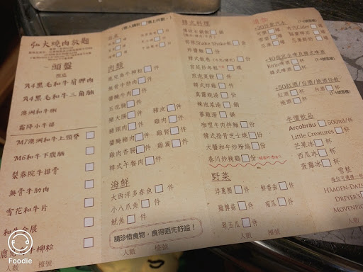 ⊙ 1. 《弘大燒肉放題》 弘大燒肉放題中,已包括頭盤和牛一份,說實話單食這個頭盤已經值回票價。當中包括,黑毛和牛舌、無骨牛肋肉、M7澳洲和牛上頸脊、黑毛和牛肩、霜降小牛排、澳洲和牛金展、黑毛和牛三角腩、牛仔骨及原條五花腩。單是這個排場,就算不食order 紙的食物,都已經值回票價。特別是M7澳洲和牛上頸脊、黑毛和牛三角腩、黑毛和牛舌、黑毛和牛肩,根本是單點燒肉的質素,看得出肥瘦比例均勻,牛味濃郁而且入口即溶,頭盤和牛實在沒得輸。