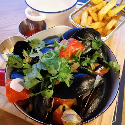 Imported Black Mussels cooked in White Wine Sauce, served with french fries & garlic aioli Extremely Tender & Umami Black Mussels but most of them had not removed the mussel hair Amazing Sauce which is mouthwatering with refreshing onion & cilantro🌿flavors. No matter with the Mussels or crispy French fries, perfect match🤝 garlic🧄aioli was creamy but not sticky, perfect texture for french fries