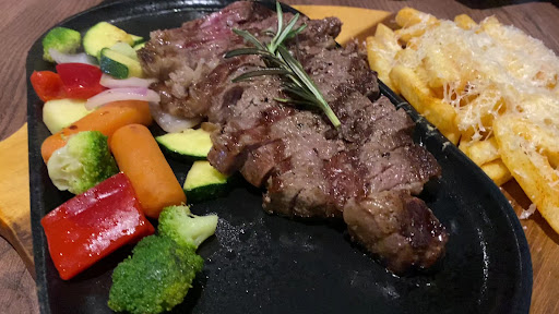 I had the pepper steak and the melted cheese appetizer. First of all, I got the appetizer after the main course because the quantity of the main course wasn't sufficient. The pepper steak itself tasted good however it was advertised as 160g, but there was no way it was over 100g. It was served upon a bed of mashed potatoes that were a bit bland but not bad. The problem is they served it in a literal pool of grease. This was clearly intended and it was pooled as if it was a gravy or coulis. It actually created a good looking presentation, but it was grease. It tasted like grease, it had the texture of grease, and it sat in my stomach like grease. Look at the picture, it was taken off the menu. That yellow stuff is just fat.
