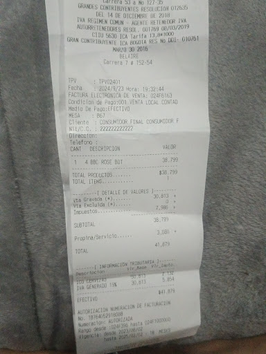 Read morePésimo servicio es increíble que las cervezas en botella cuesten más que lo que valen en un Oxxo o a domicilio me cobraron cada botella a 10.000 dónde pedí 2 BBC Cajicá miel y 2 BBC rose y según la chica la factura está bien dónde arreglo el precio y claro está si son para llevar cobra servicio y ni siquiera pregunta ya que en Colombia el servicio es voluntario..... Cómo recomendación verificar bien el valor antes de comprar y más en este...