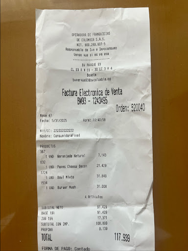 As I walked in they had a soccer ball event on Tv, the attendant seemed busy and as he was taking my order was extreamly pushy to the extent that when I asked for help he opened the ame he in a rough manner…. ( I do speak Spanish) kept my kool let it be… he also added service charge and got pushy on that as well… he repeatedly asked me more than 4 times…. He had already added it with out me giving consent…. He said his fingers got itchy and pushed the button and added it… Really ( lol )… I had an order also to go and they got it all wrong… it was cold, no forks nor napkins, I asked for catchup and mustard I did not get that…. Finally I said it was a take out order and they had it served at the Table? Really…. I don’t mind the tip if you do your job right!! Be careful in Colombia way too many changes in the food industry…. I feel sorry for the people as myself and others which we don’t care and whip out our credit cards…. Read and ask Questions and ASK to look at your RECEIPT… may the Force be with you at these food chains!! Tengan cuidado en Colombia, los meseros tratan de engañar y añaden servicios sin consentimientos del cliente….. ya se están viendo cosas raras que no existían en las cadenas de comida…. Cuídense n mucho y hagan preguntas de su factura y LEEAN bien…. Para que no les pase nada…. Y no le digan que le cobraron de más y son errores así te dicen!! ORDEN...