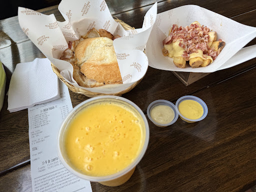 Food - The sandwiches here are excellent. To start with, the bread itself was great, it was a little crunchy on the outside but nice and fluffy inside. The bread did a great job of holding the sandwich together. My wife and I ordered two different sandwiches, one was the chicken pineapple sandwich and the other was the house special lucho sandwich. Both sandwiches were extremely satisfying. The meat, the sauces and the ingredients were all well put together. We ordered the sandwiches with avocado and bacon as an add on. The sandwiches were quite filling but we weren't feeling too heavy or greasy after. Along with the sandwich we ordered a medium sized potato fries to share which was the right quantity for the two of us. We also ordered an Agua panela and a Mora juice, both were delightful.