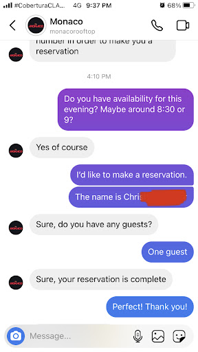 Read moreBEWARE: Made a reservation early in the day. Arrived and told it was a ONE HOUR WAIT even with a reservation. We saw at least 10 people go through without issue while we waited, oh, and get this, there was NO LINE. It was just us. Pretty ridiculous to have a reservation and be turned away or told to wait for an hour. Poor business practice, don’t even care to know what it’s like anymore. We went next door which has several food options from several different restaurants, good drinks, etc. a much better option if you don’t want to be turned away with a reservation. Monaco is a new bar but obviously has a...