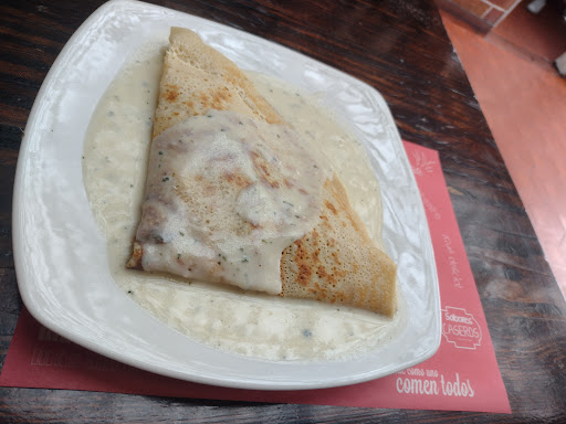 La verdad entré sin mucha fé y salí gratamente sorprendida, es de esas joyas ocultas en Bogotá, tienen un menú variado de crepes y waffles, es un sitio sencillo pero acogedor, hablando de la comida pedí un crepé de panceta y quedé feliz, de sabor delicioso, tamaño perfecto buena porción de proteína y el precio acorde, la masa fresca y con un crocante que le da un toque muy rico, waffle de fresas y banano delicioso y grande buena porción de fruta, en general el sitio es muy rico, muy...