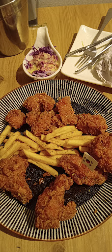Quise probar el pollo coreano, pero me llevé una gran decepción. He tenido la oportunidad de probarlo en otros países y esto no se acerca al auténtico pollo coreano. Para ser preciso, el pollo no tenía sabor, ni siquiera sal; la salsa de miel era insípida, solo unos ajonjolíes flotando en una salsa demasiado líquida. La ensalada era diminuta, como muestra la foto, y para colmo, las papas estaban recocidas y sin sal. Lo siento pero deberían darle algo de amor a...