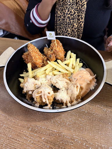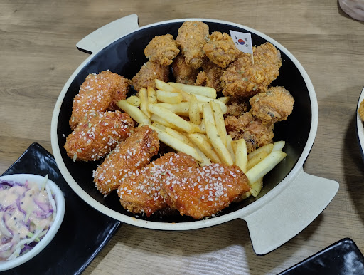 Read moreLa comida es muy especial, es pollo apanado en estilo coreano, consiste en cerca de 10 variedades de salsas muy particulares, destacan 3 tipos de salsas picantes muy buenas, otras a base de yogurt griego, o soja ajo, son combinaciones muy especiales, ofrecen alitas, cubitos de pechugas entre otras partes del pollo, se puedem elegir varias cantidades de alitas o combos para varias personas, también ofrecen aguardiente Coreano y cervezas coreanas,.