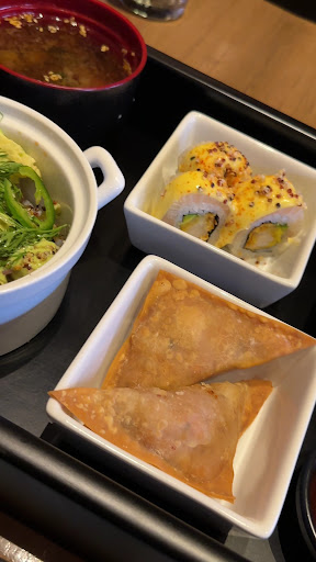 Pedí que el langostino de dentro del onigiri no fuera apanado y me dijeron que no era posible. ¿Porque no va a ser posible no apanar algo a petición de un cliente ? Pedí agua al clima y me la trajeron helada (caí en cuenta cuando ya estaba servida).