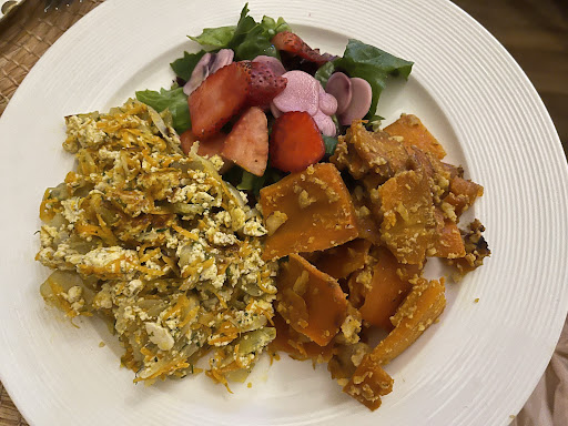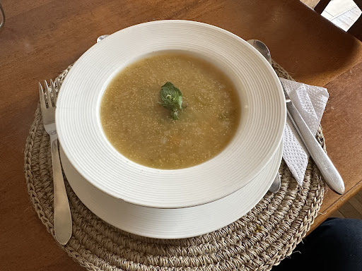 We had a nice tasting vegetable soup (I believe with kale), a plate with lentil hamburgers, boiled potatoes with a chili sauce, and an avocado salad. The lentil hamburgers unfortunately really missed the mark- it barely held together, was dry and not sufficiently salted. The sauce on the potatoes was good, as was the salad.