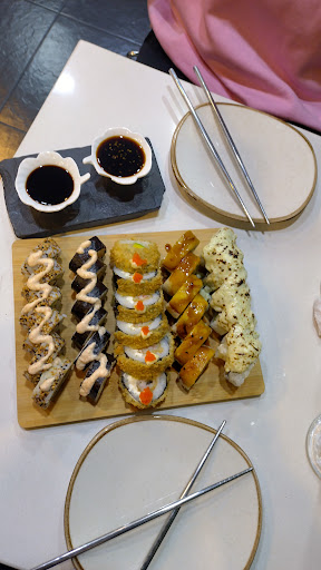 El sushi es insípido, pedí uno tempura y el sabor era literal de harina, el pescado dentro del roll casi me lo niegan porque tenía más arroz y aguacate que cualquier otra cosa. Las Gyosas fritas, definitivamente no. Puro aceite La cerveza que pedí me la sirvieron caliente. Mi cuenta fue de 41.000 pesos, pagué con un billete de 50.000 y no tenían vueltas, adicional cuando buscan las vueltas me entregan muchas monedas.