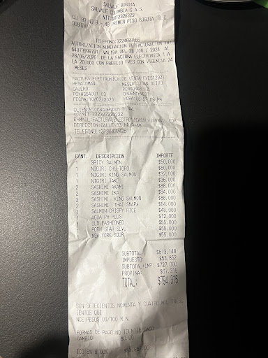 3 rolls , 3 nigiri’s and one drinks came to a whopping 530,000 COP ( $130) . My friend didn’t check the bill when she paid as she wasn’t sure what I ordered ( had to leave to meet some local coworkers ). When i did , I crossed check the prices and the charges were higher ( ie the spicy tuna was 82,000 vs 45,000) and there was a nigiri that cost 164.000 that wasn’t on the menu ( $40 for 2 which meant $20 for ONE piece ). No wonder the server kept pushing for the nigiri pieces and even the sampler platter ( which if we did order , this review would have been a Lot worse based on a previous review about being overcharged on a sampler recommendation by a server ). It’s a shame of such practice of a restaurant this caliber . Granted they’re probably not expecting the same diners to come back again but with another location in Madrid , wouldn’t they want to keep a positive image for the brand ?