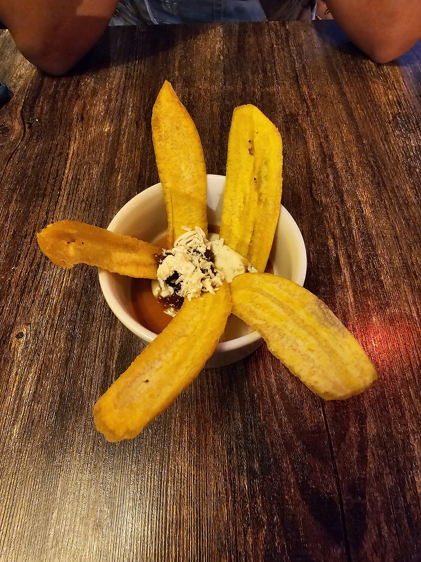 The gratis plaintain appetizer and medula fries were delicious. The small burger was ok. Food took approximately 25 minutes to arrive (no problem, I'm patient), but the meat pattie was cold 🧊. Not sure if this is the reason it didn't taste super. I had LaGloriosa's burger the next day, and their pattie is superior. Maybe LaGloriosa uses a leaner or higher quality meat, or maybe it's the way it's char-grilled. Not sure, but it was better.
