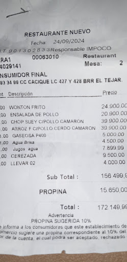 Read moreAnstelle des bestellten chop suey pollo,kahm es mit schweinefleisch und wenig pollo. Der wirt verrechnete 10000 pesos mehr als das bestellte und behauptete ich hätte das so bestellt!auf der rechnung wahr noch camaron verrechnet obwohl es keins im chop suey hatte! Die Zutaten wahren nicht frisch und riechte überhaupt nicht asiatisch( kein sesam,kein soja usw.)camaron im reis stinkte nach fisch! (nicht frisch) Der Wirt war gar nicht einsichtig noch kulant.werde das restaurant nie wieder besuchen noch...