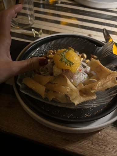 What we ordered: Tacos de langostinos: excellent 👌 Sashimi matsuri: the salmon and tuna were dried up as if they had been sitting out in a fridge for a while. The dish overall had no flavor, even with the sauce, which ran off the plate and spilled all over the table when we poured it over the fish as instructed Sea Bass / Róbala asado: overcooked to the point that I struggled to cut through the fish around the edge and could barely chew it. The crispy things on top tasted...