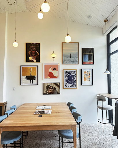 El ambiente es simplemente encantador. Desde el momento en que entras, te envuelve una decoración cuidadosamente pensada, que equilibra lo moderno con toques acogedores y naturales. Las luces cálidas, los cuadros que decoran las paredes y los espacios amplios y cómodos te hacen sentir como en casa, pero con toda la inspiración que necesitas para concentrarte en tus proyectos o reuniones.