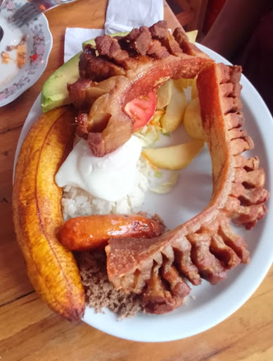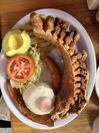 Read moreHuge portion of typical Bandaje Paisa. Giant chicharrón, chorizo, blood sausage, powdered beef, bowl of bean soup with pork hock, fried egg, fried plantain, rice, french fries, avocado and salad. We got 3 portions for the 5 of us and it was still too much. It was 180,000 COP for 3 plates and 2 beer each.