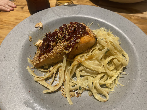 Read moreHay varios puntos que quiero tratar para justificar mi calificación. En primer lugar, aunque el lugar es grande y tiene una decoración y trabajo de interiorismo destacable, el hecho que todo sea en concreto hace que la reverberación sea incontrolable y el murmullo de las conversaciones de todas las personas se escuchen al cien! Nada agradable para un lugar donde quieres relajarte, comer, compartir y disfrutar una buena experiencia, en mi caso, no podía escuchar a mis amigos que estaban al extremo opuesto de la mesa. Por otro lado, cabe destacar que la carta es muy amplia y con opciones que te hacen desear probar todo. En mi caso pedí langostinos en nuez, y aunque la descripción menciona que se sirve con pasta, al llegar el plato me decepcione porque los langostinos son muy pocos. Para la relación pasta/langostinos, el plato debería llamarse pasta con…, más no dar la idea que el langostino es lo principal. En cuanto a la preparación, deliciosa, totalmente. El lugar estaba demasiado lleno, asumo que eso hizo que se retrasara nuestra comida, pero ni siquiera nos pasaron las bebidas con prontitud. La amabilidad y servicio del personal es destacable. Pagas entre $50.000 y $60.000 por plato, asi que esperas una experiencia que en su totalidad sea memorable, pero en mi caso, la incomodidad del ruido excesivo y lo que comento del plato, son razones suficientes por las que no regresaría. De nuevo destaco, que las preparaciones en sí, estaban...