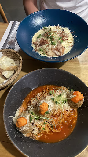 We ordered the bruschettas and burrata capressa for starters and my lord the burrata was so flavorful with a gorgeous pesto sauce (unfortunately no pictures). The bruschetta could’ve been toasted a bit longer but was otherwise very nice in flavor as well. For our mains we had carbonara and pomodoro pastas. The carbonara was rich and creamy, delicious. The pomodoro sauce wasn’t as rich as I’d hoped, but again still tasty. You could clearly taste fresh ingredients in every dish. And the service was top notch too, very friendly and quick! Overall would 100% recommend this place even if it was only for the burrata and for supporting the lovely employees. Next time I’ll try the...