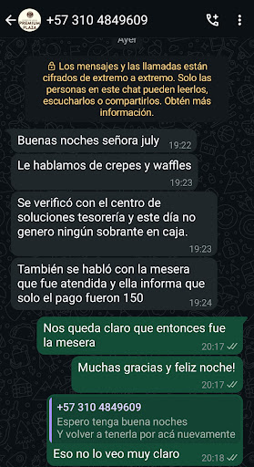Desde que tengo uso de razón, frecuento esta cadena de restaurantes porque siempre he quedado satisfecha con el sabor de sus productos y con el servicio en general. Es uno de esos lugares que acostumbro recomendar a mis amigos que visitan el país, debido a la variedad de platos que manejan, los cuales se acomodan a todos los gustos. Pero el pasado 13 de agosto, tuvimos una mala experiencia, en la sede Premium Plaza, cuando visité el lugar con una amiga mexicana y un amigo español. Ese día, yo revisé la cuenta como acostumbro y sumaba 144 mil con el servicio, pero al decir el valor en voz alta el español entendió 154 mil, así que entregó a la mesera 200 mil en billetes de 50 mil, el estaba esperando una devolución de 46 mil, pero para su sorpresa la mesera solo le entregó 6 mil, él reclamó y ella indicó que la devuelta correspondía a un pago de 150 mil. Era su palabra contra la nuestra y como vimos que la discusión no tenía sentido decidimos irnos, pero la seguridad de la mesera nos generó duda y decidimos revisar el dinero que un par de horas antes habíamos retirado y restar los gastos realizados y había justo un faltante de 50 mil. Por lo tanto, llamé para hablar con la administradora de la sede, quien dijo que iba a verificar en tesorería, quedé un poco inconforme con la respuesta como pueden ver en la imagen y afirmé que quedaba claro que fue la mesera, pero también ella se pudo confiar y entregar el dinero en caja, en fin...lo cierto es que andamos con nuestro sinsabor por lo ocurrido y dejo el precedente para que mejor eviten pagar con efectivo...