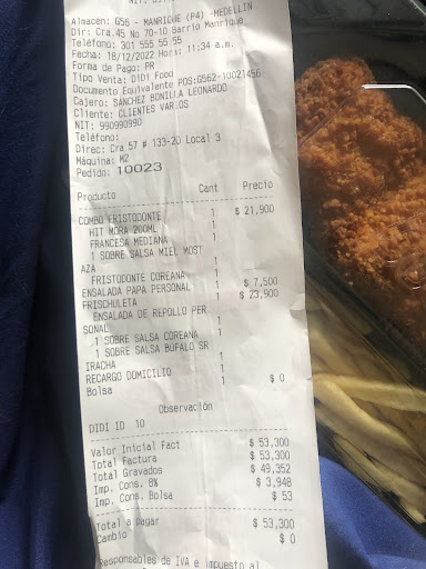 Read moreUn restaurante demasiado pequeño para tanta demanda ,se forman filas interminables y ni decir de los domiciliarios a cada instante pasando por encima de los clientes con sus bolsos inmensos en la espalda ,deberían por consideración con ellos facilitarles su labor sin necesidad de recorrer el sitio e incomodar a los clientes un sitio bien incómodo ,bien estrecho y completamente lleno de personas haciendo fila,personas esperando hasta una hora para recibir un pedido,otros esperando para ser atendidos y encima los rapid una total desconsideracion ,que el dueño de frisby invierta un poquito todo para el bolsillo...