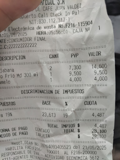 Read moreEl servicio es bueno aunque nada especial para el precio, la forma de vender de Juan Valdez me parece poco honesta con el cliente, pues le hacen ofertas cerradas de productos con poca información para que el cliente elija, pienso que la idea debería ser satisfacer al cliente no obtener lo máximo posible de él. Por otro lado el café me lo sirvieron...