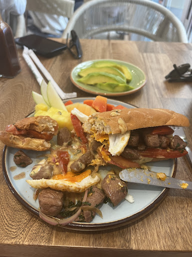 This is a very pretty place to sit and read a book, from their wide selection of new editions. I have visited twice, hoping for improvement bc this city certainly would benefit from this place being a success. I decided not to write a review after my first abysmal visit bc I knew they were recently opened and I wanted to give them time to work things out. I returned after a couple of weeks and though the service has improved, the food has not. The prices on the pastries are very reasonable. I find them dry. The sourdough bread is good and a great price to value. The coffee is really quite bad which surprises me bc they have Amor Perfecto supporting them. In my last visit, my group ordered 4 different coffee beverages and we were all left unimpressed. One was a ‘tropical cold brew’ that was served in a small wine glass that couldn’t have been more than 6oz and was mostly ice, price: COP15.900. How did it taste? So bad I actually put table salt in it to improve it, which it actually did. The coffee in all four drinks was watery and lacked any complexity. All of the coffee drinks that were served cold had much more ice than liquid. The food is very pricey. I ordered the huevos migas, a typical breakfast dish. To complete what to me is normal in a breakfast egg dish, I added cheese, bacon and avocado. The price of my dish with the additions was over COP55.000. For reference, the ribeye at Serena (arguably one of the best dinner restaurants in Santa Marta) costs COP69,500 and it comes with potatoes, arugula, and vegetables. The sandwiches are supposed to be their savory specialty, given that they are a bakery, and they are utterly preposterous. The bread is long and narrow, and they stack them with stuff that simply doesn’t fit on the bread, it falls out. This happened to be on both my visits after making comment to the staff. The people around me faced the same experience. Photo for reference.