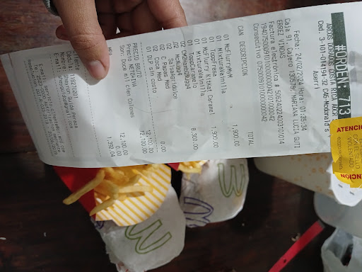 Read moreEs por mucho la peor Mc Donald's que he visto y a la que he ido, nunca falta que den una orden mal, ya sea por uber eats o en el mismo restaurante (he ido presencialmente también). Un día pedí una porción de pollo frito y en lugar de eso me mandaron 2 hamburguesas con queso y una mc pollo, también otro día me dieron un fresco medio lleno y no completo, otro día pedí 2 pintos y esa vara venía con menos de una cucharada de pinto, la triple con bacon ni traía bacon (ADJUNTO FOTOS DE TODOS LOS PRODUCTOS MAL HECHOS)