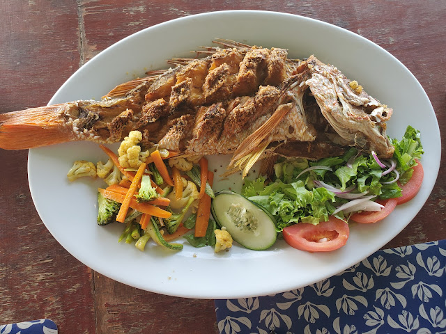 Sunset is precipitous and we did our best to time things so we were seated before the sunset was at its prime. Between courses, we walked the dark beach hand in hand, although sometimes my skirt got wet (my fault) when the tide fooled me. A guitar-singer musician group commutes along the beach between various restaurants, and they're just great.