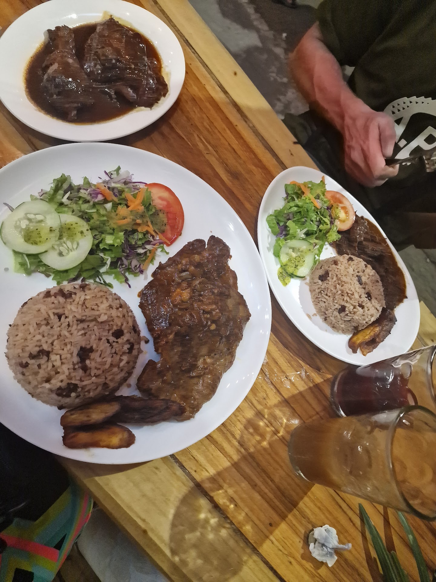 Read morePuerto Viejo is a tourist trap. Even though I like to support local business, I'm not in the age group which waits in line to be seated or be served meager portions at a high cost. I ordered the seafood platter at $13 and got 3 pinky shrimps, 3 sea shells, 5 mussels, 2 squid rings and 3 quarter sized fish filet dice. No pictures, I was upset. It was a meal for an 8 year old child. I saved the night out by feeding on my side order of fried plantains which I dipped in the coconut sauce that came with the seafood platter. The green salad was good. It came glazed in a passion fruit dressing. Local traditional drink known as "Hiel" was what I ordered to go with my dinner. It's made out of sugar cane, ginger. Truly refreshing. I was so unsatisfied with the seafood platter that I had to order a local traditional pastry known as "Patty" to calm my hunger. This pastry has ground beef inside which is spiced up and is kind of hot, but it's very tasty. Service was below average. WiFi password worked in spite of being told...