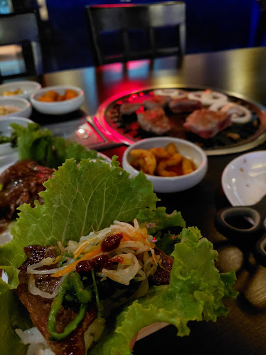 Después, el plato fuerte. Yo me pedí unas entrañas, creo que se llamaban, y ¡wow, pero wow! Ellos les dan tipo unos toppings para hacerse el arrolladito coreano con la lechuga. Cuando le pones todo con la carne, es una explosión de sabores. Y la carne en sí estaba demasiado buena, La carne tenía una buena cantidad, era súper jugosa y de muy buena calidad, con un sabor espectacular.