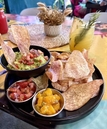 Read moreThe setting itself and the band were really good, the place looked nice and had a vibrant atmosphere. Our food took about 45 minutes for the appetizer and an hour+ for the main but it was busy and we weren’t in a rush, it’s vacation, so no complaints there. The food itself didn’t blow my hair back though - we started with guacamole which, to be fair, I didn’t read the details of on the menu - it was a suggestion from the server after we ordered mains and sometimes I like to go a little crazy so I said yes, treat yo self. When it came out it had some odd type of vegetable chip instead of tortilla - again, I hadn’t read the menu so that’s on me but I thought it was an interesting choice for a guacamole dipping format - broke pretty easily and not much flavour. The guacamole itself seemed more like an avocado mash, it seems like they may have forgotten the cilantro, lime juice, garlic and salt.. and not just that but they may have even developed a chemical process to remove the avocado taste from the avocados.. maybe a Nobel prize for this. I felt like I had been smoking for 20 years and lost my tastebuds.. but I don’t smoke. After that I had the spinach stuffed chicken and my partner had a vegan rice bowl. These were fine.. again I questioned if they had any salt in the kitchen as it almost had negative flavour, and the rice was a bit undercooked and tasted bland enough that it might be an accountant as it’s day job. My partners bowl was a similar experience. Overall, cool place.. food was a bit overpriced when It had the flavour...
